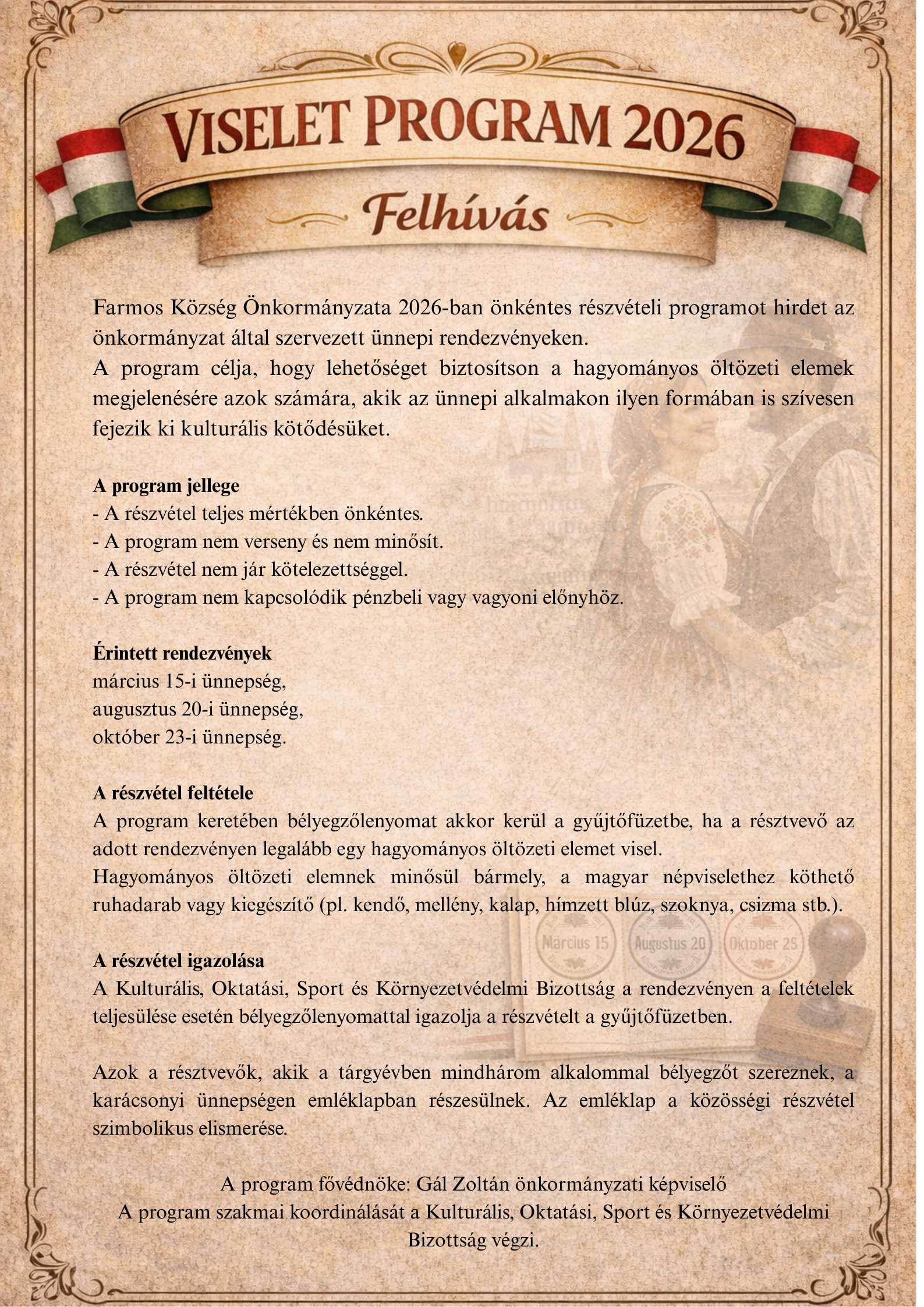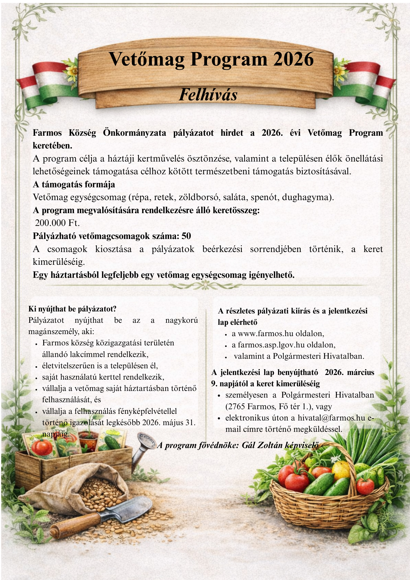Tájékoztató zöldhulladékgyűjtő zsákok átvételéről - Az információ letöltése - A meghatalmazás letöltése A MÁV Személyszállítási Zrt. tájékoztatta az Igazgatóságot, hogy 2026. április 7-től április 30-ig a Ferencváros és Budapest-Kelenföld állomások között végzett munkák miatt a 120a sz. Budapest - Újszász - Szolnok vasútvonalon a vonatok módosított menetrend szerint közlekednek. - Az információ letöltése Víztorony mosatási értesítő - A mosatáási értesítő (április 28) letöltése - A mosatáási értesítő (április 29) letöltése Vetőmag program 2026 - A jelentkezési űrlap letöltése - A vetőmag program szabályzat letöltése - A plakát letöltése Viselet program - A plakát letöltése A MÁV Személyszállítási Zrt. tájékoztatta az Igazgatóságot, hogy 2026. március 20-án 20:00-tól március 22-én éjfélig a Budapest-Keleti és Rákos állomások között végzett pályakarbantartási munkák miatt a 120a sz. Budapest - Újszász - Szolnok vasútvonalon a vonatok módosított menetrend szerint közlekednek. - Az információ letöltése Közmeghallgatás 2026.02.27 Meghívó - A meghívó letöltése 2026. február 28-án és március 1-én a Rákoshegy és Maglód állomások között végzett pályakarbantartási munkák miatt a 120a sz. Budapest - Újszász - Szolnok vasútvonalon a vonatok menetrendje jelentősen változik. Egyes vonatok korábban indulnak, valamint egyes vonatok nem közlekednek. - Az információ letöltése 2026. február 14-től 15-ig és 21-től 22-ig a Tata és Almásfüzitő felső állomások között végzett pályakarbantartási munkák miatt a 120a sz. Budapest - Újszász - Szolnok vasútvonalon egyes vonatok módosított menetrend szerint közlekednek. - Az információ letöltése 2026. február 27/28-án, február 28/március 1-én, március 6/7-én és 7/8-án a Szolnok állomáson végzett pályakarbantartási munkák miatt a 120a sz. Budapest - Újszász - Szolnok vasútvonalon egyes vonatok módosított menetrend szerint közlekednek. - Az információ letöltése Igazgatási ügyintéző állás - Igazgatási ügyintéző állás hirdetés letöltése Házi segítségnyújtás Farmoson 2026 - Házi segítségnyújtás Farmoson 2026 információ letöltése 2026. évi hulladékgyűjtési rend - A 2026. évi hulladékgyűjtési rend letöltése Meghívók - A Kultúrális bizottsági ülés meghívó - A Pénzügyi bizottsági ülés meghívó - A testületi ülés meghívó Adatközlési tájékoztató - A tájékoztató letöltése Víz torony mosatása 2025.10.10 - Az információ letöltése 2025. október 13-tól november 5-ig a Ceglédbercel-Cserő - Cegléd állomások között végzett pályakarbantartási munkák miatt a 120a sz. Budapest - Újszász - Szolnok vasútvonalon egyes vonatok módosított menetrend szerint közlekednek.. - Az információ letöltése Közmeghallgatás 2025.10.10 - A meghívó letöltése 2025. október 3-án 20:50-től október 8-ig a Kőbánya felső és Rákos állomások között végzett pályakarbantartási munkák miatt a 120a sz. Budapest - Újszász - Szolnok - Az információ letöltése Cső hálózat mosatása 2025.09.22 - 23 - Az információ letöltése 2025. október 3-4-én, 4-5-én, 10-11-én és 11-12-én a Szolnok állomáson végzett pályakarbantartási munkák miatt a 120a sz. Budapest - Újszász - Szolnok vasútvonalon egyes vonatok módosított menetrend szerint közlekednek, valamint egyes vonatok helyett Abony és Szolnok, továbbá Újszász és Szolnok között MÁVBUSZ-ok közlekednek. - Az információ letöltése A MÁV Személyszállítási Zrt. tájékoztatta az Igazgatóságot, hogy 2025. augusztus 24-től 2025. szeptember 20-ig felújítási munkálatok miatt a vonatok Budapest-Keleti pályaudvart nem érintik. A pályakarbantartási munkák miatt a 120 sz. Budapest—Szolnok—Békéscsaba—Lőkösháza és a 120a sz. Budapest - Újszász - Szolnok vasútvonalon egyes vonatok módosított menetrend szerint közlekednek. - A hirdetmény letöltése A MÁV Személyszállítási Zrt. tájékoztatta az Igazgatóságot, hogy 2025. augusztus 23-tól 2025. augusztus 24-ig a Kőbánya kiágazás és Rákos állomások között végzett pályakarbantartási munkák miatt a 120a sz. Budapest - Újszász - Szolnok vasútvonalon egyes vonatok módosított menetrend szerint közlekednek. - A hirdetmény letöltése Sertéstarók hirdetmény - A hirdetmény letöltése - Az adatkezelési tájékoztató letöltése - A nyilvántartásba vétel letöltése TELEPÜLÉSRENDEZÉSI ESZKÖZEINEK M Ó D O S Í T Á S A, A 311. SZ. FŐÚT ÉS PÁRHUZAMOS KERÉKPÁRÚT FEJLESZTÉSSEL ÉRINTETT TERÜLETEKEN - A hirdetmény letöltése Partnerségi Hirdetmény 311 - A hirdetmény letöltése Írásbeli véleményezés - Az írásbeli véleményezés letöltése (szerkeszthető) MÁV vágányzár 2025. július 11-től július 14-ig - Az információ letöltése 2025.06.26 Testületi ülés meghívó - A meghívó letöltése 2025.06.26 Pénzügyi Bizottsági ülés meghívó - A meghívó letöltése 2025.06.25 Kulturális Bizottsági ülés meghívó - A meghívó letöltése II. Féléves Hulladéknaptár 2025 - A naptár letöltése Pénzügyi ügyintéző állás - Az álláshirdetés letöltése 2025. május 23-tól 2025. május 25-ig a Mende és Sülysáp állomások között végzett pályakarbantartási munkák miatt a 120a sz. Budapest – Újszász – Szolnok vasútvonalon egyes vonatok módosított menetrend szerint közlekednek.. - Az információ letöltése A MÁV Személyszállítási Zrt. tájékoztatta az Igazgatóságot, hogy 2025. május 12-től 2025. május 16-ig az Újszász és Szolnok állomások között végzett pályakarbantartási munkák miatt a 120a sz. Budapest – Újszász – Szolnok vasútvonalon egyes vonatok módosított menetrend szerint közlekednek. - Az információ letöltése MÁ
